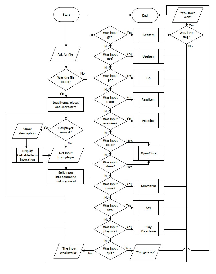 When the program begins, there are no items, characters or places in the game. The program asks the user which game file (which will have the .gme file extension) they would like to use. If the program fails to find the file, then a message will be displayed to the player telling them that the game could not be loaded, and the program will terminate. If the file is found, then all of the items, characters and places in that file are loaded into the program, and the game runs as below.