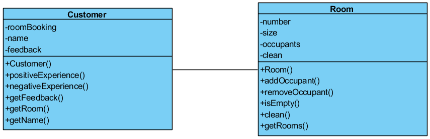 UML class diagrams can also show association between classes. For example, in the program for Task 2, the customer class is associated with the room class because there is a relationship between rooms and customers (i.e. customers have bookings for certain rooms, and each room can contain different customers). This is demonstrated by a line connecting these classes in the diagram as follows: