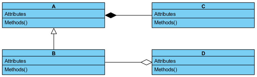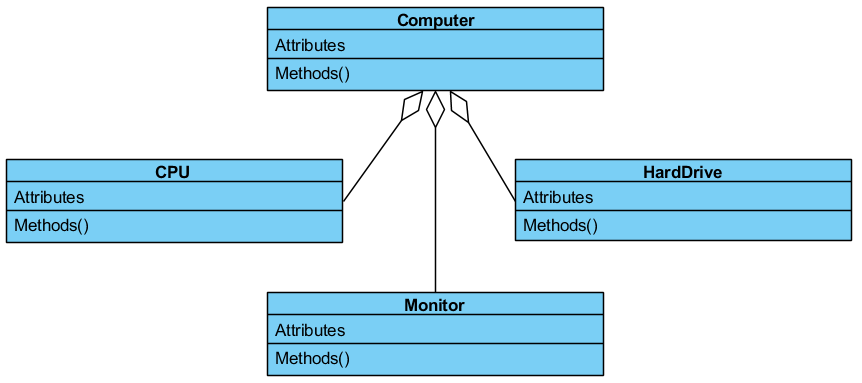 The end of each line with the hollow diamond is the aggregation class, and the other ends of the lines are the component classes. In this case, Computer is an aggregated class, while CPU, Monitor and HardDrive are component classes.